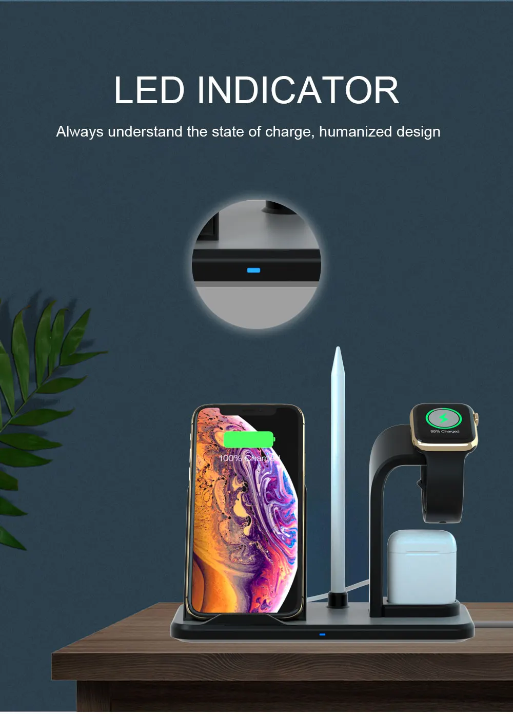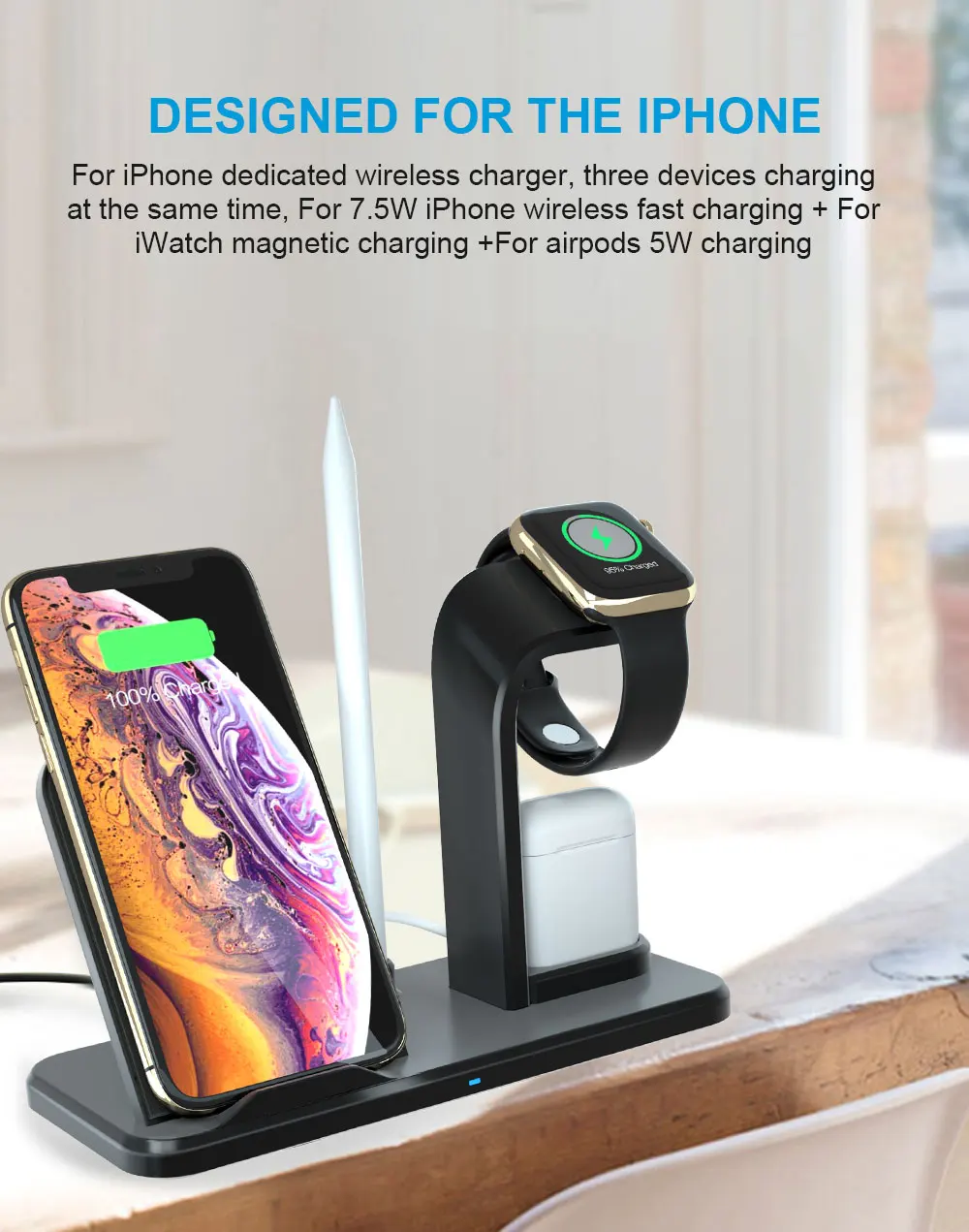 【4 in 1 Wireless Charger Station】Support fast wireless charger for iPhone ,samsung and other Qi Enabled phones. The charging docks holder is designed for the Airpods and it can also be used as a holder for the pencil. Wireless charging speed is up to 15% faster than others.